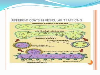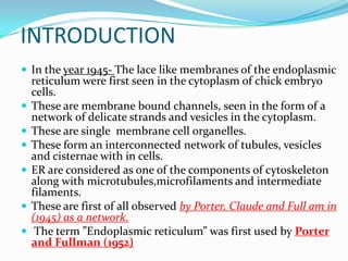 This document provides an overview of the endoplasmic reticulum (ER). It begins by describing the initial observations of the ER in 1945 and defines it as a network of tubules, vesicles and flattened sacs within cells. There are two main types - the rough ER (RER) which is studded with ribosomes, and the smooth ER (SER) which lacks ribosomes. The RER synthesizes proteins and is involved in glycoprotein formation, while the SER functions in lipid and carbohydrate metabolism, detoxification, and production of other cell organelles. Transport between the ER and Golgi apparatus occurs via transport vesicles. The sarcoplasmic reticulum is a form of SER found in muscle cells and stores and