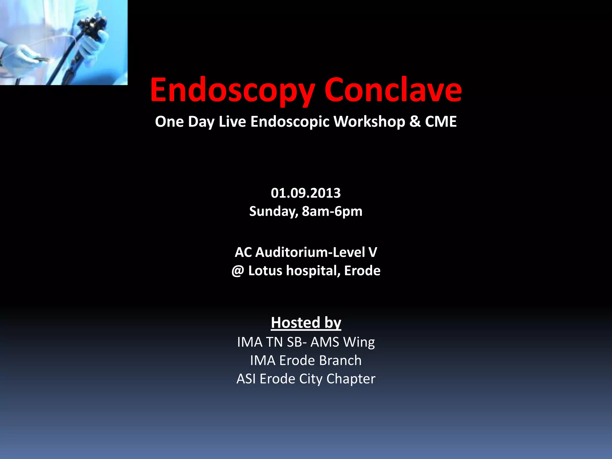 The document announces a one day endoscopy conclave featuring live endoscopy workshops, lectures, panel discussions and training opportunities. The morning session includes basic and advanced live endoscopy workshops covering diagnostic endoscopy, banding of varices, sclerotherapy, stricture dilatation and stent deployment. The post-lunch session includes a panel discussion on team approaches to GI disorders and live colonoscopy/ERCP workshops. The day concludes with a humor session in gastroenterology and an award ceremony. The event aims to provide training to become a competent endoscopist through additional Sunday sessions.