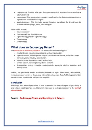 Endoscopy is a medical procedure that allows examination of the body's internal structures using a thin tube with a camera. Different types of endoscopy, such as colonoscopy and bronchoscopy, can identify various health issues related to the digestive, urinary, and reproductive systems, among others. This procedure not only aids in diagnosis but also enables healthcare providers to treat conditions and perform surgeries.