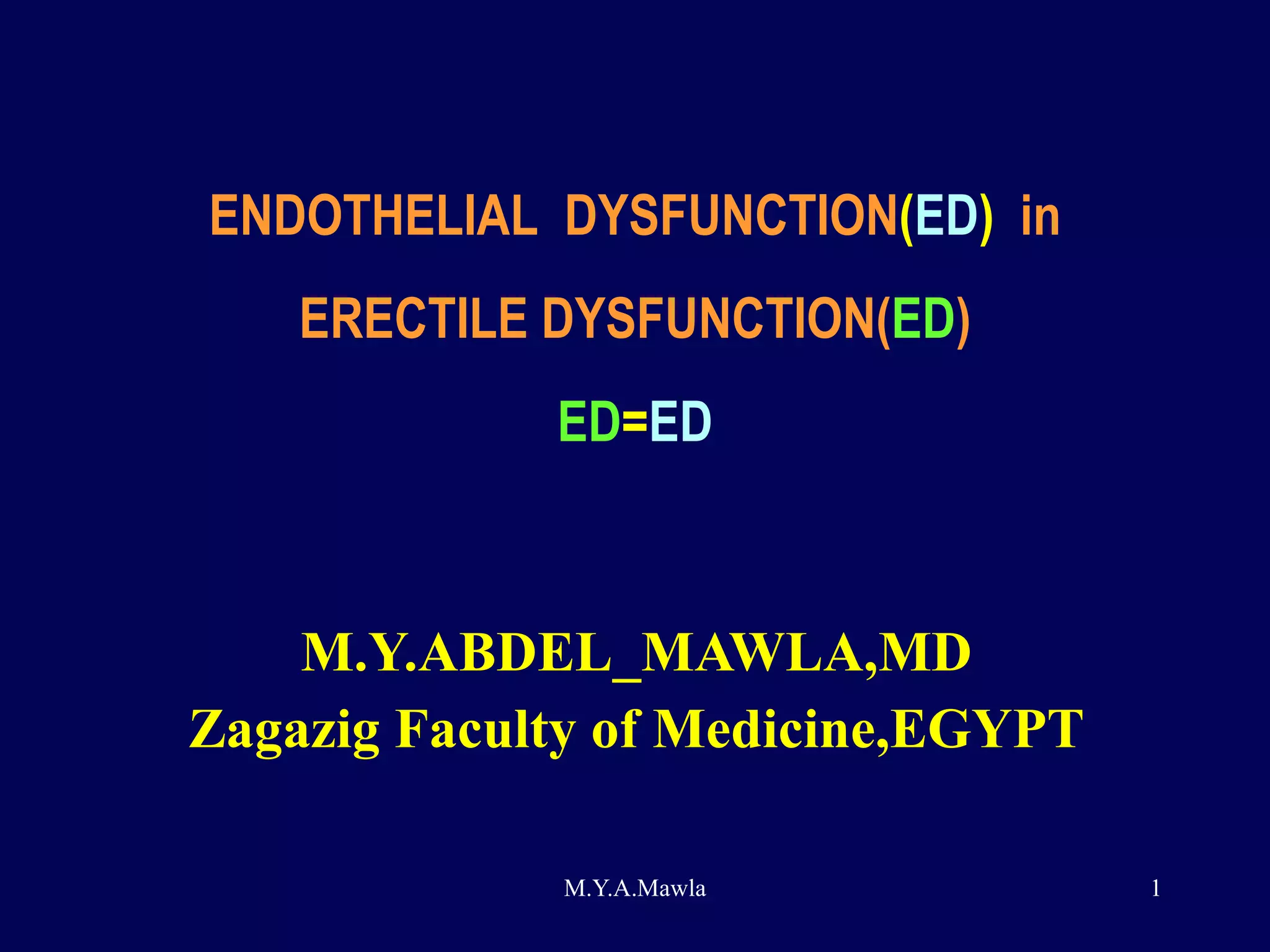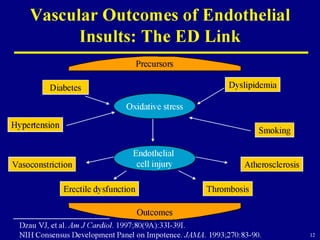 Endothelial dysfunction (ED) plays a central role in erectile dysfunction (ED). ED reduces the bioavailability of nitric oxide (NO), which is important for relaxation of the corpus cavernosum and penile erection. Risk factors for ED and endothelial dysfunction include diabetes, smoking, hypertension, hyperlipidemia, and other conditions that promote oxidative stress and reduce NO bioavailability.
