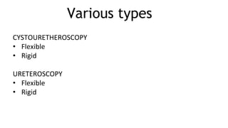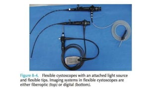 The document details various types of endourology procedures, including cystourethroscopy and ureteroscopy, which are used for diagnostic and therapeutic interventions in the urinary tract. It outlines the advantages and techniques of rigid and flexible cystoscopes, as well as the necessary patient preparation and techniques for ureteroscopy. Key components and equipment needed for these procedures are also highlighted, emphasizing considerations for safety and effectiveness.