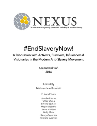 This document is an introduction to a compendium that summarizes over 90 sessions from a working group focused on combatting human trafficking and modern slavery. It provides background on the working group, called the Nexus Human Trafficking and Modern Slavery Working Group, which was launched in 2014 with the goal of leveraging the skills and networks of its members to end human trafficking and modern slavery through policy changes, partnerships, social impact investments, and other means. The compendium compiled here summarizes information from the working group's weekly conference calls and webinars with over 100 speakers in the anti-trafficking movement. It is intended to educate and mobilize readers to join the fight to end modern slavery.