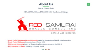 This document provides an overview of Oracle's end-to-end cloud offerings including Java Cloud Service (JCS), Mobile Cloud Service (MCS), Mobile Application Framework (MAF) and JavaScript Extension Toolkit (JET). It demonstrates how these services can be used together in a sample application for tracking warehouse stock usage and notifications. The document outlines the technology used, application flows, service interactions and provides code snippets for integrating MCS and JET/MAF. It also demonstrates deploying a JET application to Application Container Cloud.