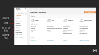 Sungmin Kim, an AWS Solutions Architect, discusses Amazon SageMaker for end-to-end machine learning. SageMaker provides a fully managed service for building, training, and deploying machine learning models in the cloud. It offers tools for labeling data, running automated machine learning, training models with built-in algorithms or custom code, tuning hyperparameters, and deploying models for inference through endpoints. SageMaker aims to make machine learning more accessible and productive for developers through its integrated development environment called Amazon SageMaker Studio.