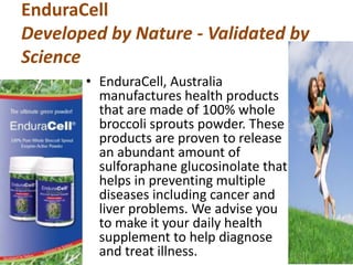 Enduracell, Australia, manufactures health products using 100% whole broccoli sprouts powder, rich in sulforaphane glucosinolate known to help prevent diseases like cancer and liver problems. Despite the health benefits, the average vegetable intake among the population is low, with cruciferous vegetables like broccoli notably underrepresented. The product is developed in collaboration with a scientific team to ensure a standardized sulforaphane concentration for optimal health support.