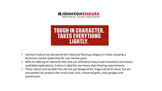 Johnson Endura has established itself as a leading force in India's industrial flooring sector for over twelve years, offering durable tiles suitable for heavy-duty applications. The company utilizes advanced manufacturing technology and maintains high-quality standards with ISO certifications. With a global presence and a commitment to innovation, Johnson is recognized as India's largest tile manufacturer, backed by various international quality certifications.