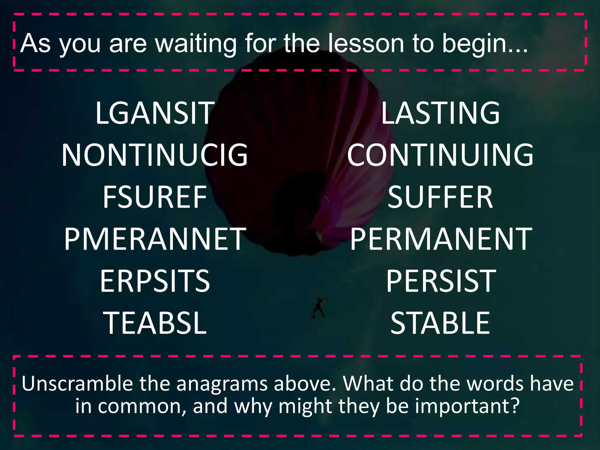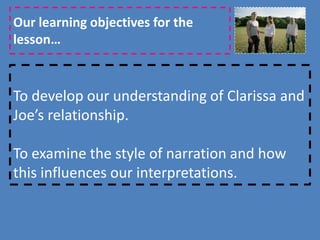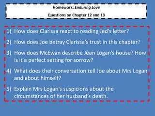 The document provides instructions for students waiting for their lesson to begin by having them unscramble words related to lasting or enduring concepts. It then outlines the learning objectives of considering the significance of the title of the novel Enduring Love and gaining insights into the author Ian McEwan's basis for the novel. Finally, it asks students to look at images and relate them to characters and themes in the novel based on their reading so far.