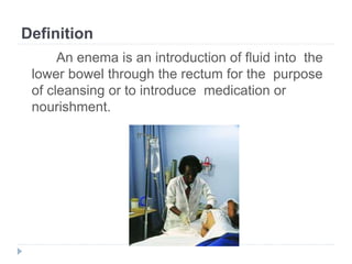 An enema is the introduction of fluid into the lower bowel through the rectum to cleanse or administer medication. There are several types of enemas that serve different purposes such as treating constipation, softening stool, administering medication, or nourishing patients. The document outlines various enema solutions used, including soap and water, oil, glycerin, and medications. It also describes procedures for administering different types of enemas and important safety considerations.