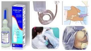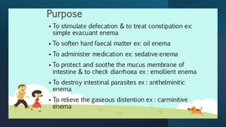 The document discusses the process and considerations for administering enemas to facilitate bowel elimination, including types of enemas, administration techniques, and factors affecting bowel health. It details indications for use, potential complications, and the importance of proper equipment and hygiene. Additionally, it emphasizes patient comfort and safety throughout the enema administration process.