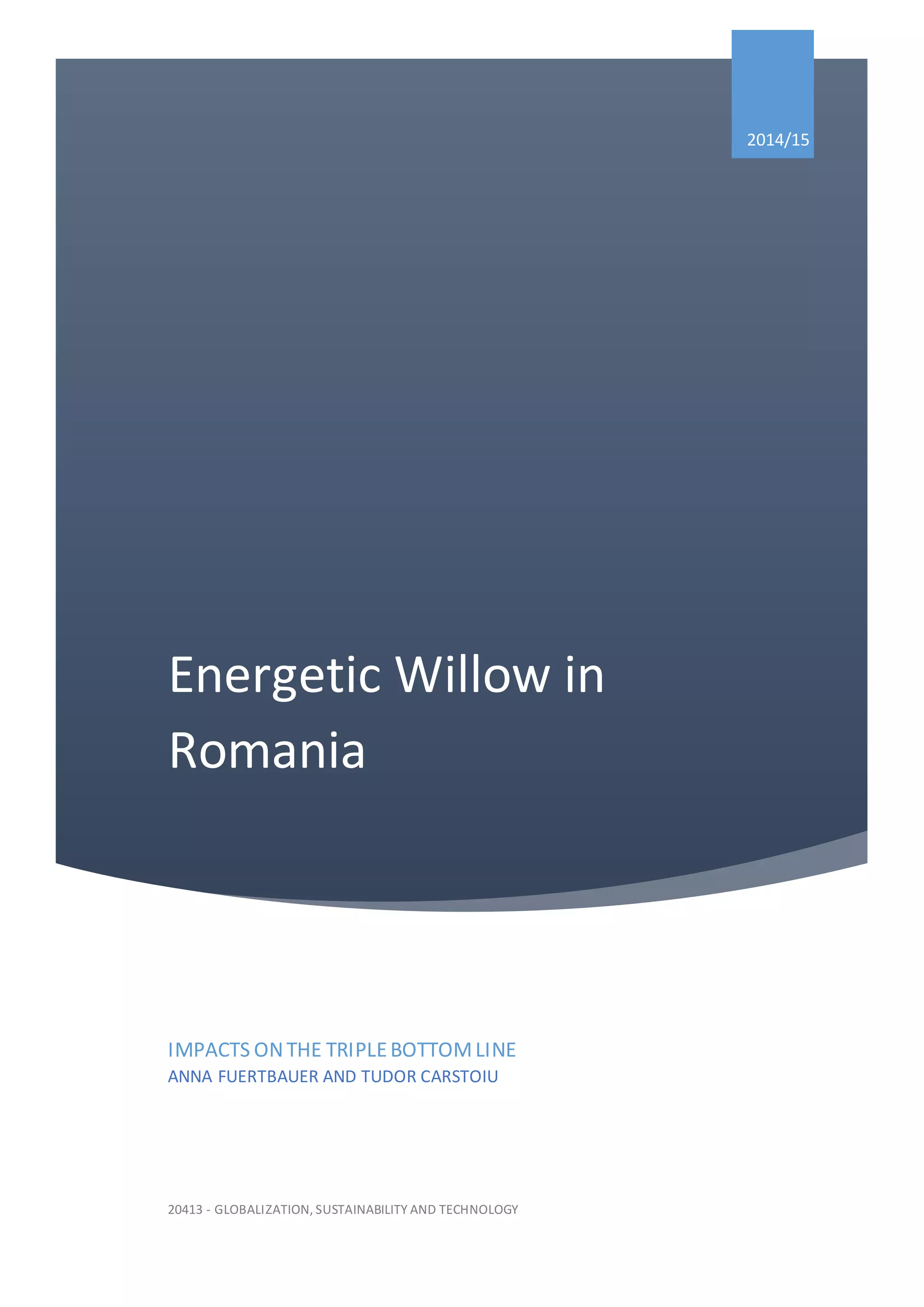 This document discusses the impacts of growing energetic willow in Romania from 2014-2015. It focuses on the triple bottom line impacts, including social, environmental, and economic factors. Specifically, it notes that energetic willow cultivation provides social benefits through job creation. Environmentally, it enables carbon neutral energy production and absorption. Economically, energetic willow is profitable for farmers due to low costs, high yields, and market demand for biomass. The document also provides background on supportive EU policies and favorable preconditions for willow growth in Romania.