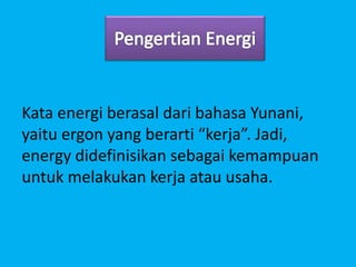 Dokumen tersebut membahas tentang berbagai jenis energi seperti energi mekanik, energi potensial, energi kinetik, energi bunyi, energi kalor, energi cahaya, dan energi nuklir. Juga membahas interaksi antara benda dan energi serta penggunaan energi dan dampaknya terhadap lingkungan. Selain itu membahas juga tentang radiasi, jenis radiasi, interaksi antara benda dan radiasi, serta penggunaan dan dampak radiasi terhadap ling