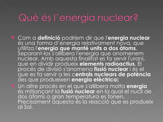 Com a definició podríem dir que l' energia nuclear és una forma d’energia relativament nova, que utilitza l' energia que manté units a dos àtoms . Separant-los s'allibera l'energia que anomenem nuclear. Amb aquesta finalitat es fa servir l'urani, que en dividir produeix elements radioactius . El procés de divisió s'anomena fissió nuclear i és el que es fa servir a les c entrals nuclears de potència (les que produeixen energia elèctrica ) Un altre procés en el que s'allibera molta energia és mitjançant la fusió nuclear en la qual el nucli de dos àtoms a gran temperatura es fonen. Precisament aquesta és la reacció que es produeix al Sol.