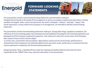 Energold Drilling Solutions is a global drilling company providing services to the mining and energy sectors. It operates 133 rigs in 24 countries. The presentation discusses Energold's diversified business segments including mineral drilling, energy services, manufacturing, and water drilling. It highlights financial results from 2010-2014, growth strategies, and social and environmental initiatives. Analyst coverage and investment opportunities in Energold are also mentioned.