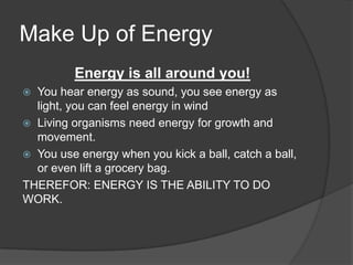 This document discusses the different forms of energy including mechanical, heat, chemical, electrical, and gravitational energy. It defines energy as the ability to do work and explains that there are two states of energy: potential and kinetic energy. Potential energy is stored energy while kinetic energy is energy in motion. The document aims to teach students about the various types of energy and provide examples of each.