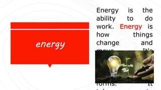 Energy is the ability to do work and causes things to change and move. There are different forms of energy that fall into kinetic energy, involving motion, and potential energy, involving stored energy. Energy can change from one form to another but can never be destroyed. Key types of energy include thermal, chemical, nuclear, electrical, sound, motion, light, gravitational, and elastic energy.