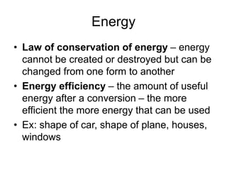 - Energy conversions allow useful energy to be extracted and support daily life through machines, though some energy is lost as thermal energy during conversions. Common conversions include light to chemical energy through photosynthesis and chemical to kinetic energy through cellular respiration.