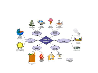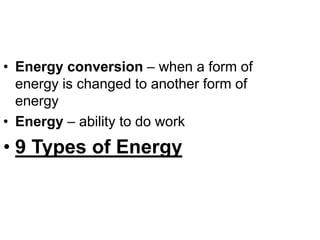 - Energy cannot be created or destroyed, but can be changed from one form to another through energy conversions. There are nine main types of energy including kinetic, potential, mechanical, thermal, chemical, electrical, sound, light, and nuclear energy.