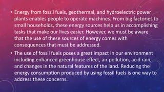 Energy from fossil fuels, geothermal, and hydroelectric power plants enables people to operate machines and accomplish tasks, but their use has environmental consequences. The use of fossil fuels significantly impacts the environment through air pollution, greenhouse effects, and land changes. Reducing energy consumption from fossil fuels through conservation and efficiency can help address these concerns. Renewable energy sources like geothermal and hydroelectric also have less emissions than fossil fuels but can still impact the environment if not properly planned. Assessing impacts and reducing demand can help limit new power plant construction and their environmental effects.