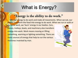 This document defines and describes different types of energy. It begins by explaining that energy allows for work and movement in both human and mechanical systems. It then defines potential and kinetic energy. Several common forms of energy are also outlined, including mechanical, solar, light, heat, electrical, sound, chemical, and nuclear energy. Examples are provided to illustrate each type. The document concludes by discussing energy transformations and the law of conservation of energy.