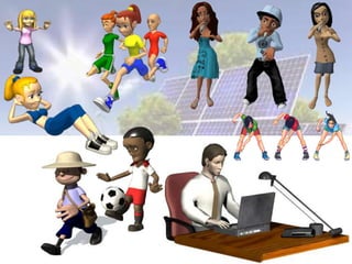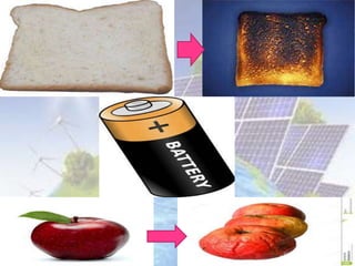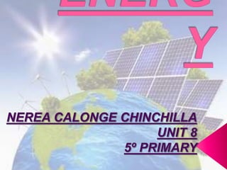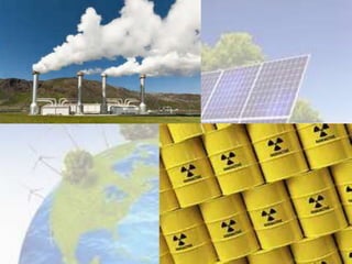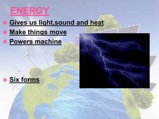 This document discusses different forms of energy: light energy, chemical energy, sound energy, kinetic energy, electrical energy, and thermal energy. It provides examples of different renewable and non-renewable energy sources, how they are used, and their environmental impacts. Key renewable sources mentioned include solar, wind, water, biomass, and geothermal, while non-renewable sources include fossil fuels and uranium. The document also covers electricity and magnetism.
