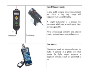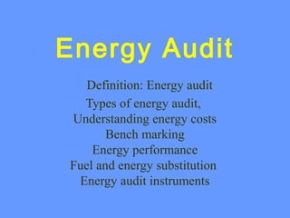 This document discusses energy audits and provides information on related topics. It defines an energy audit, describes the objectives and types of energy audits. It also discusses benchmarking, energy conservation opportunities, and instruments used in energy audits. Conversion factors and the Energy Conservation Act are outlined. Methodology, steps, and components of preliminary and detailed energy audits are summarized.