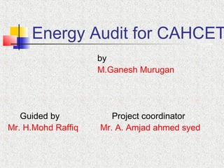 This document summarizes an energy audit conducted for CAHCET college. The audit identified various energy conservation methods that could be implemented, such as replacing lights with more efficient bulbs, installing insulation and making adjustments to air conditioning usage. It was estimated that these conservation methods could save over 45,000 units of electricity per year, equating to cost savings of over 160,000 rupees annually. This would reduce the college's electricity usage and costs by approximately 16.84% and 12.2% respectively. In conclusion, the energy audit provided recommendations to make the college's energy usage more efficient and achieve significant savings.