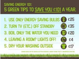 The document discusses energy conservation and climate change. It defines energy conservation as any behavior that results in less energy usage, such as turning off lights. It states that climate change poses a serious threat and that global temperatures are rising at an unprecedented rate due to human activity like carbon dioxide emissions. The document advocates for addressing this issue through improving energy efficiency in technology and changing energy-consuming behaviors to use less energy and reduce waste.