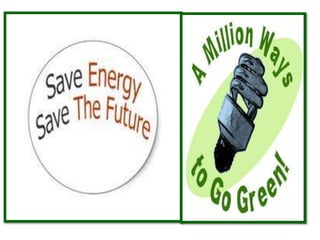 This document discusses energy conservation. It defines energy as the ability to do work and identifies renewable energy sources like solar and wind and non-renewable sources like fossil fuels. It explains that we need to conserve energy because resources are limited and demands are increasing. Some ways to conserve include recycling, turning off unused devices, and replacing old light bulbs. Specific tips provided include not leaving lights on unnecessarily and analyzing appliance energy efficiency. Energy conservation helps save money and reduce pollution. India relies heavily on fossil fuel imports for its energy needs and conservation can help address this.