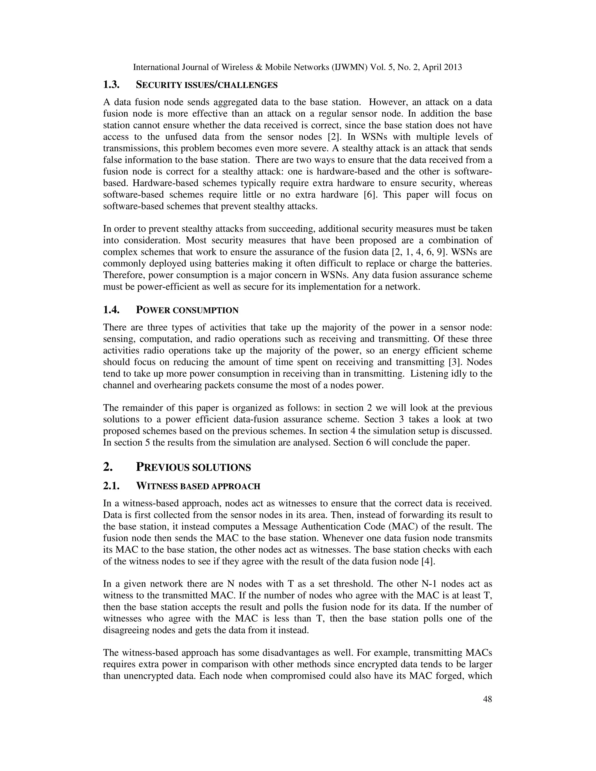 The document discusses energy consumption in wireless sensor networks (WSNs) through data fusion assurance methods, emphasizing the balance between security and power efficiency. Several data fusion assurance schemes are compared, including witness-based approaches, direct voting mechanisms, and newer proposals aimed at reducing energy consumption, such as silent negative voting and time-slotted methods that incorporate sleep/wakeup scheduling. The paper evaluates the effectiveness and energy efficiency of these methods through simulation results, highlighting the necessity of power-efficient designs in WSNs due to battery constraints.
