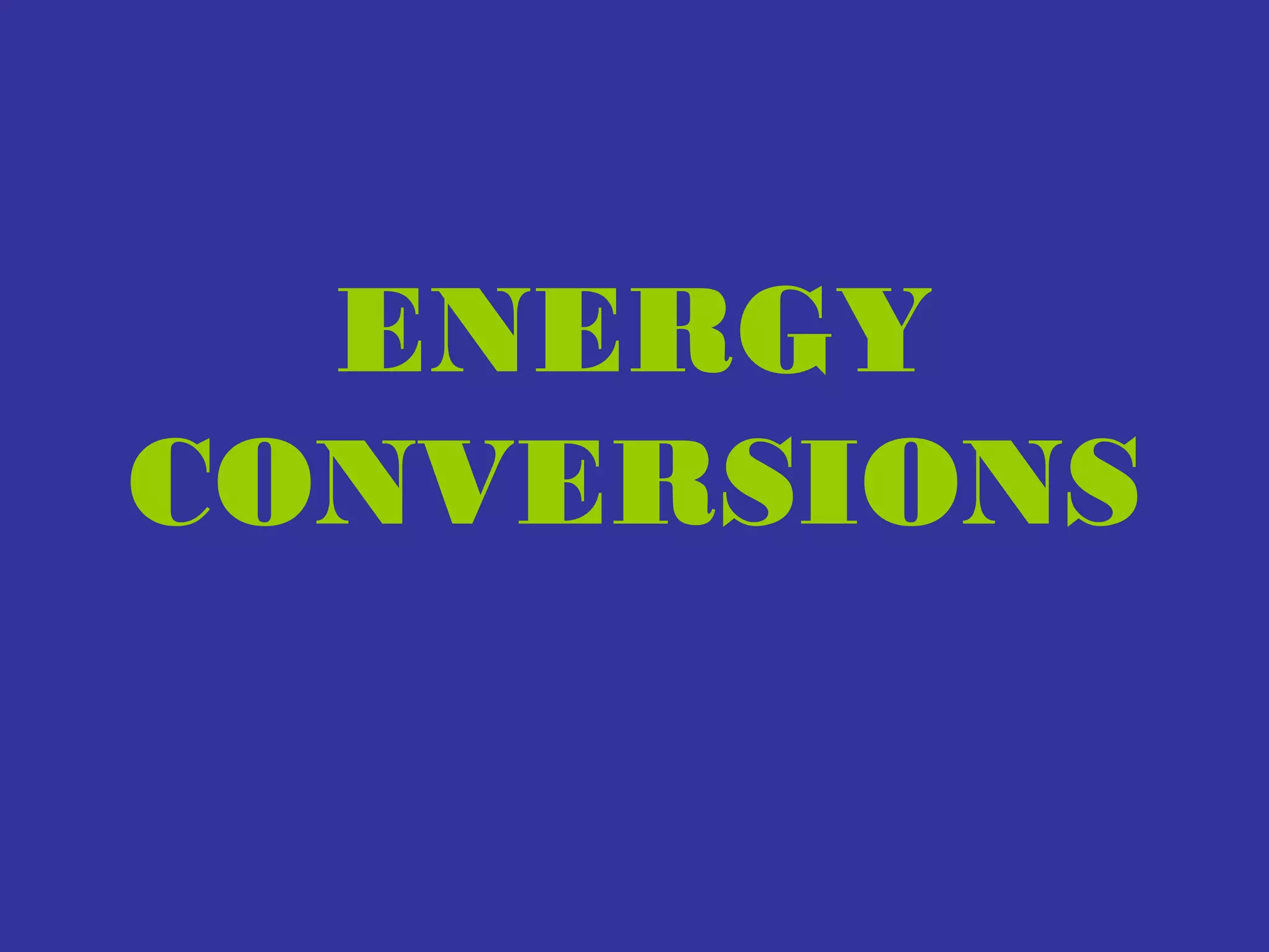 The document discusses different types of energy conversions. It presents several examples of objects and asks the reader to identify the type of energy conversion each represents. The examples include a moving bicycle wheel (mechanical energy), an appliance plugged into an outlet (electrical energy), anything that gets hot (thermal/heat energy), anything that makes a noise (sound energy), energy that can be seen (radiant/light energy), energy that changes form like fuel (chemical energy), and energy of an atomic nucleus (nuclear energy). The document encourages using these examples to identify the energy conversions for six machines depicted on a poster.