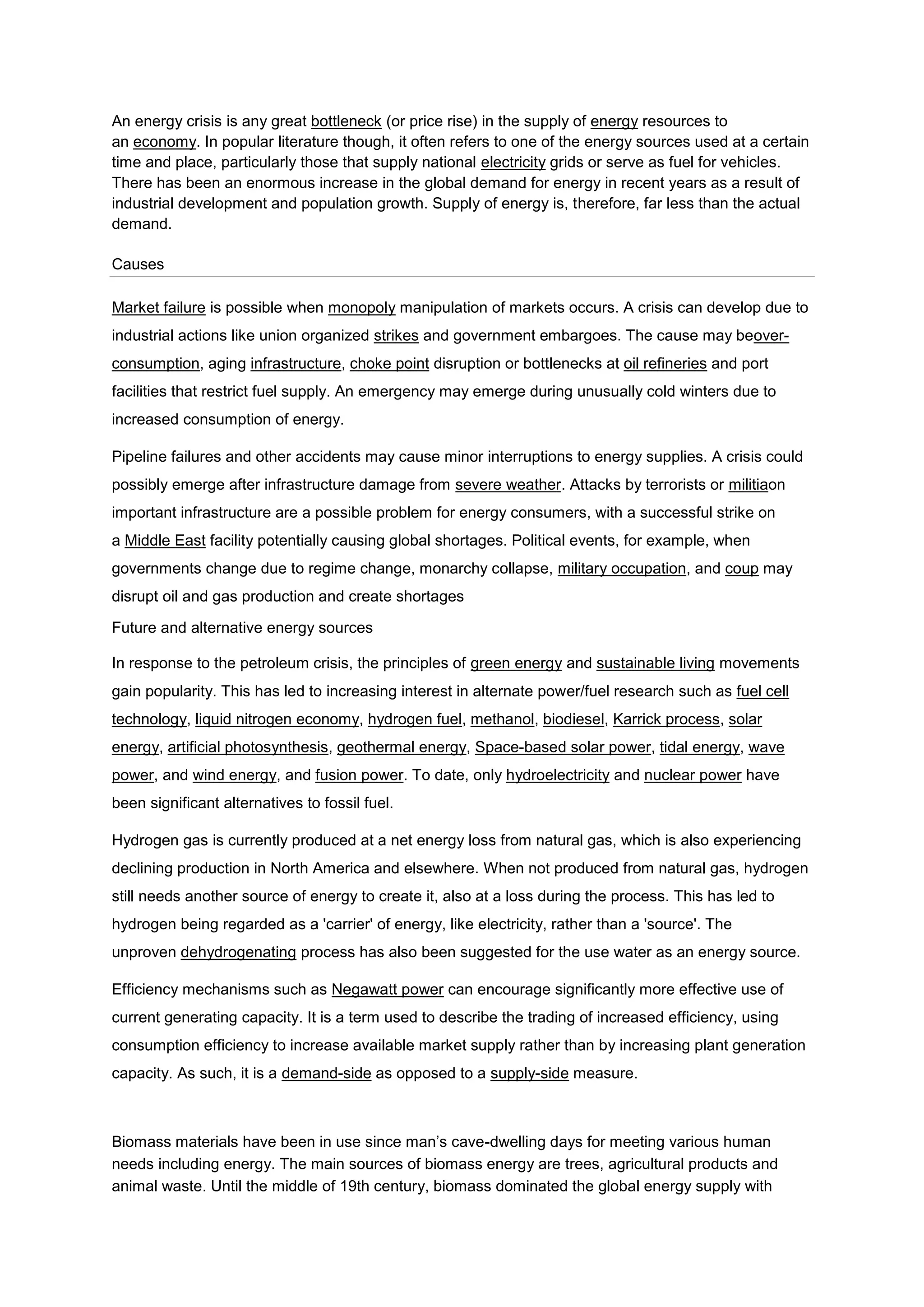 An energy crisis occurs when there is a bottleneck in the supply of energy resources to an economy. Demand for energy has greatly increased due to industrialization and population growth, but supply cannot meet demand. This can be caused by market failures, infrastructure issues, disruptions or planned outages. Alternative energy sources like biomass are gaining popularity in response to concerns over petroleum. Biomass currently contributes significantly to India's energy supply but faces challenges in becoming a major competitor to fossil fuels. Initiatives like Husk Power Systems show promise in using biomass waste for rural electrification in India.