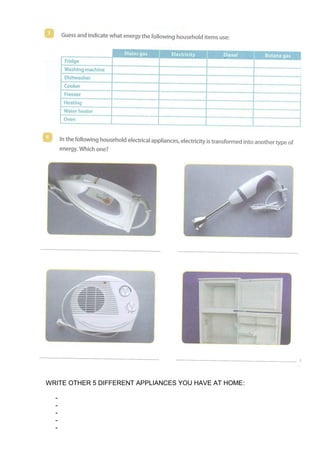 This document appears to be an assignment from a student named Segimon Comas School. The student is asked to list 5 appliances in their home, provide example sentences on how each appliance is used, and compare two telephones by describing their differences using comparative sentences and expressions. The assignment is related to the subject of energy and aims to have the student practice writing descriptive sentences to compare appliances and telephones.