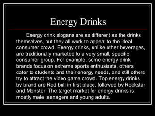 Energy drink companies market their products to specific consumer groups like extreme sports enthusiasts, students, and gamers. The top energy drinks are Red Bull, Rockstar, and Monster, which target male teenagers and young adults. Energy drink advertisements use symbols, appeals to needs for sex, affiliation and escape, and imply that drinking their product will make one's life more exciting or empowering.