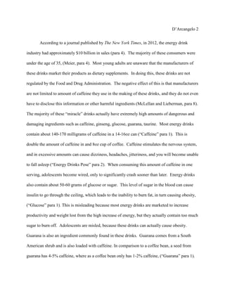 This document discusses the dangers of energy drinks, especially for adolescents. It notes that energy drinks have become increasingly popular among youth for their caffeine boost but contain high amounts of sugar and other stimulants like guarana and taurine that can cause health issues. The document argues that energy drinks should be banned for those under 18 or more strictly regulated due to links between energy drink consumption and risks like obesity, heart problems, and even death.