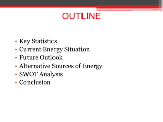 The document provides an overview of Mexico's energy sector, highlighting key statistics such as a 2009 population estimate of 108 million and a GDP of $1.459 trillion. It notes a heavy reliance on fossil fuels with 89% dependence and challenges related to infrastructure, declining reserves, and economic issues. The conclusion emphasizes the need for diversification towards renewable energy sources to mitigate future supply threats.