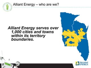 This document discusses energy efficiency programs and opportunities for farms. It provides an overview of Alliant Energy, which serves over 1,000 cities and towns in its territory. Alliant offers free farm energy audits and rebates to help farmers identify and implement energy efficient equipment upgrades. The document then discusses common on-farm energy uses, when to invest in efficiency, key equipment to examine, and how energy audits can document savings opportunities from switching to higher efficiency lighting, ventilation systems, and other equipment.