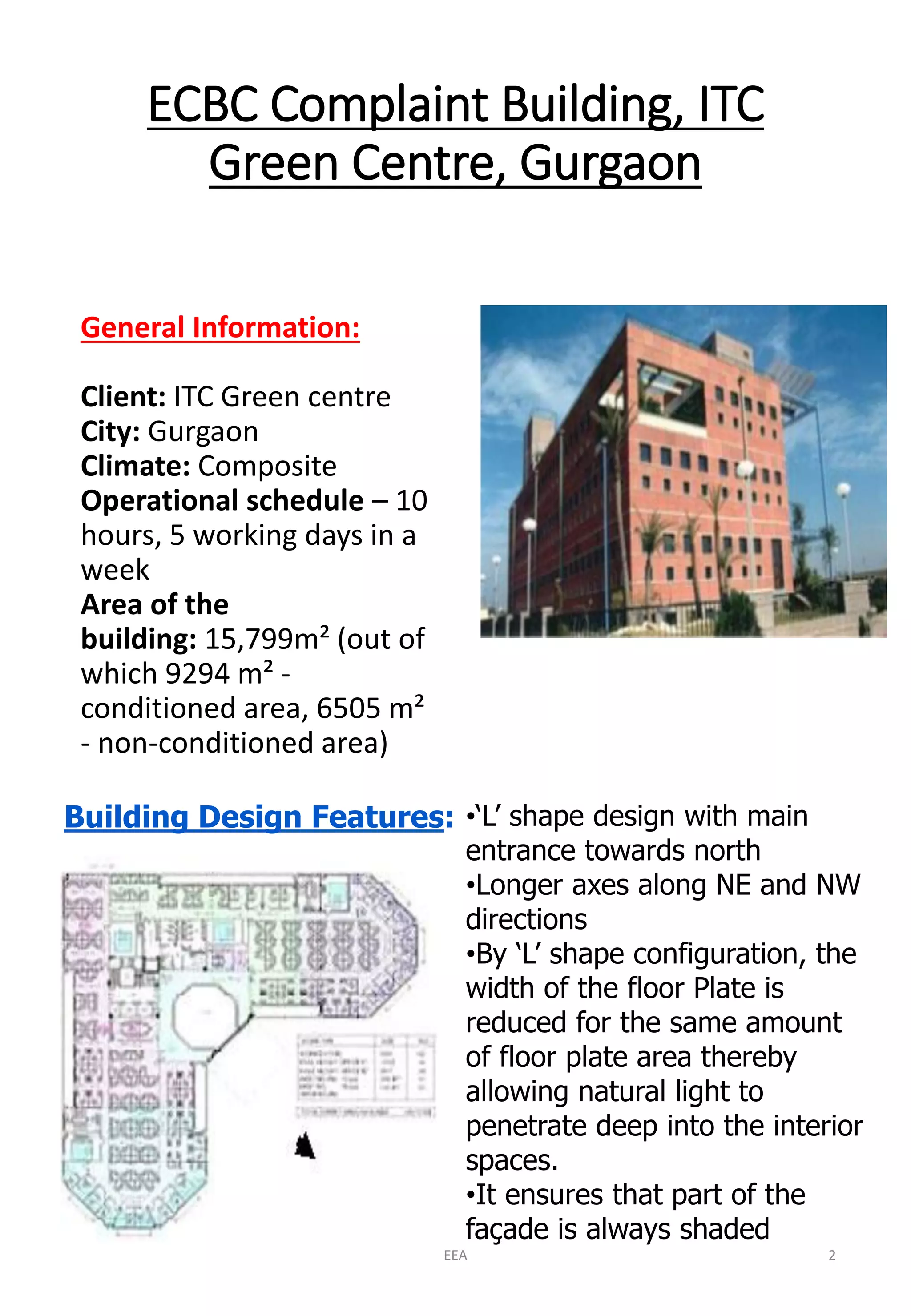The document discusses case studies of energy-efficient buildings, focusing primarily on ITC Green Centre in Gurgaon and CSR House in Australia. ITC Green Centre employs features like an 'L' shape design, double-glazed windows, and advanced daylight control systems to enhance natural lighting and reduce energy consumption. CSR House emphasizes effective insulation, ventilation, and intelligent lighting controls to achieve high energy efficiency, aiming for an 8-star rating in thermal comfort.