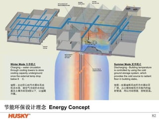 The document presents energy-saving and environmentally friendly design concepts implemented by Microsoft, focusing on efficient temperature control and resource management in building facilities. Systems mentioned include cold storage for temperature regulation, advanced HVAC systems, and innovative lighting solutions that maximize natural light. The integration of automation and sensor technologies enhances performance while minimizing energy waste, achieving a significant reduction in energy consumption compared to traditional systems.