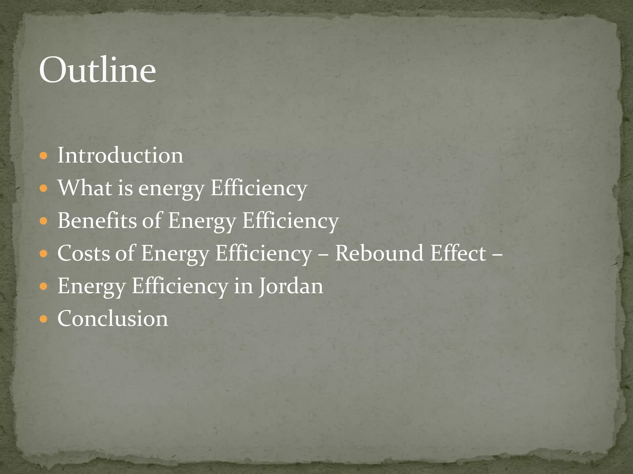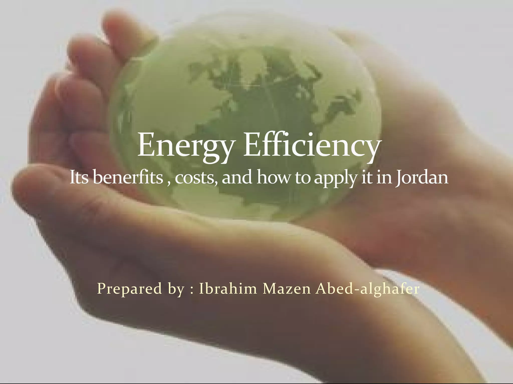 This document discusses energy efficiency and its importance. It defines energy efficiency as the level of energy consumption required to provide a given service based on both technical and non-technical factors. The benefits of energy efficiency include energy savings, increased disposable income, reduced greenhouse gas emissions, poverty alleviation, and job creation. However, energy efficiency also faces costs in the form of rebound effects, where consumers increase their consumption in response to energy efficiency gains. The document also examines energy efficiency in Jordan, where initiatives aim to increase renewable energy production and public awareness to reduce energy demand.