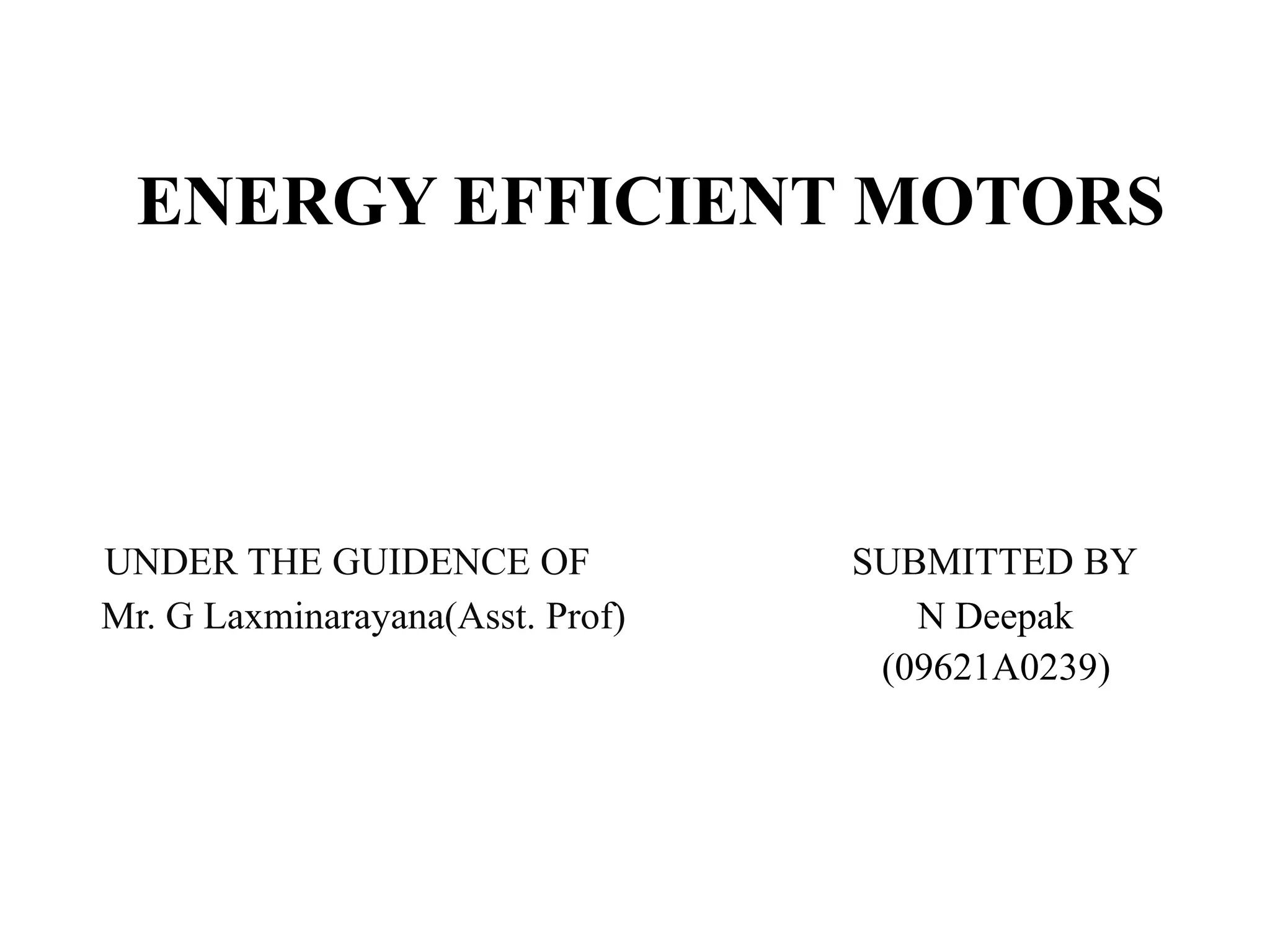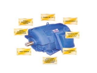 Energy efficient motors (EEMs) use less input power than standard efficiency motors to produce the same output, saving energy. EEMs are manufactured with improvements like higher quality steel and copper that reduce losses. While EEMs have higher initial costs, their energy savings lead to payback periods of less than five years. Wide adoption of EEMs in industry could significantly reduce electricity usage and costs while lowering environmental impacts from reduced greenhouse gas emissions during electricity production.
