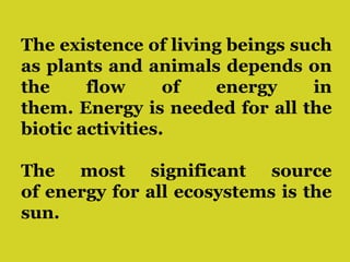The document discusses energy flow through ecosystems. It makes three key points: