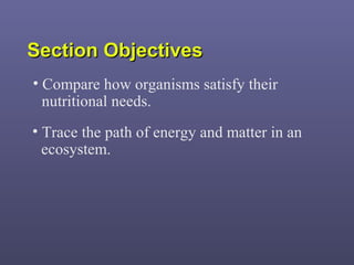 This document discusses ecosystems and energy flow between organisms. It begins by defining producers (autotrophs) which get energy from the sun through photosynthesis. Consumers (heterotrophs) depend on producers for nutrients and include herbivores, carnivores, scavengers, and decomposers. Energy and matter are transferred between trophic levels in food chains and food webs. Ecological pyramids illustrate how biomass, numbers, and energy decrease at higher trophic levels due to energy lost as heat. Cycles of water, carbon, nitrogen, and phosphorus allow these essential elements to be reused in ecosystems.