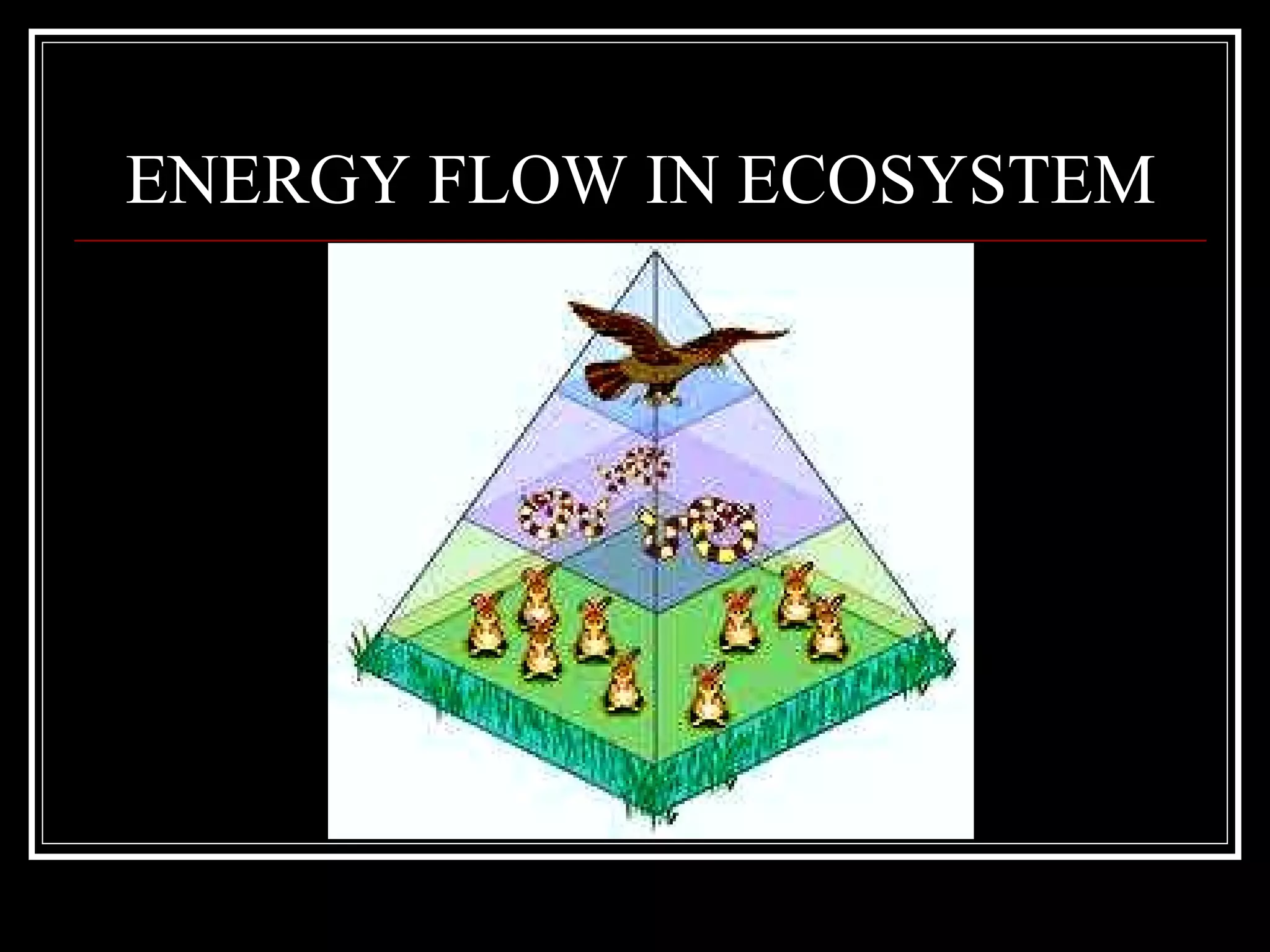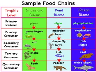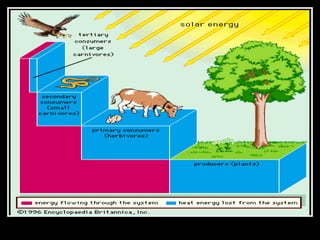 The document summarizes energy flow through ecosystems. It explains that all energy on Earth comes from the sun and is absorbed by producers like plants through photosynthesis. Producers are then eaten by primary consumers like herbivores and secondary consumers like carnivores. Decomposers break down waste and dead organisms, releasing energy and returning nutrients to the system. This flow of energy is depicted through food chains and food webs. Only 10% of energy is transferred between trophic levels, causing energy pyramids to narrow at higher levels. Key matter cycles like water, carbon, and oxygen are driven by the ecosystem and also flow in loops through producers, consumers, and decomposers.