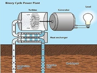 The document discusses different forms of energy including heat, chemical, electromagnetic, nuclear, and mechanical energy. It then focuses on different renewable and nonrenewable energy resources. Renewable resources discussed include solar, geothermal, wind, biomass, and hydroelectric/water energy. Nonrenewable resources discussed are nuclear energy and fossil fuels like coal, petroleum, and natural gas. The document provides details on how these different forms of energy work including descriptions of solar panels, wind turbines, hydroelectric dams, and geothermal systems.