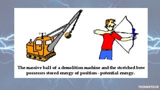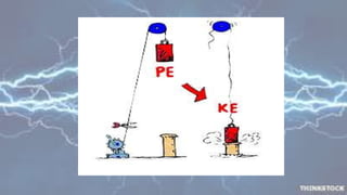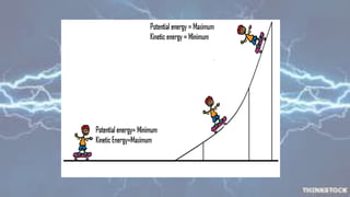 Potential energy is the energy stored in an object due to its position or state. Kinetic energy is the energy of motion. When an object moves, its potential energy is converted to kinetic energy. For example, when a ball is thrown upwards, it has maximum kinetic energy when moving fastest and maximum potential energy when stopped at the highest point. As it falls, potential energy is transferred back to kinetic energy. Similarly, water at the top of a dam has potential energy that is converted to kinetic energy as it falls, powering generators to produce electricity. In a closed system, the total mechanical energy, the sum of potential and kinetic energy, remains constant as one form is converted to the other.