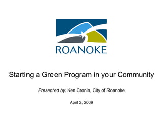 This document provides an overview of starting a green program in a community. It discusses motivations for implementing green initiatives, such as financial savings and environmental risks. Some initial steps outlined are assigning oversight of actions, tracking energy usage, and determining the community's carbon footprint. Examples of green programs discussed for communities include more energy efficient buildings, alternative energy use, and increased recycling and reforestation efforts. The document concludes by summarizing Roanoke, Virginia's green programs and their effects, such as a 1.5% reduction in greenhouse gas emissions from municipal operations.