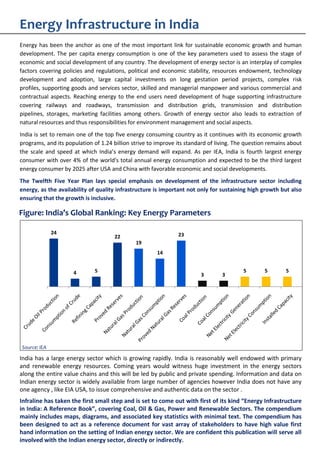 This document provides a summary of the first report titled "Energy Infrastructure in India: A Reference Book" published by Infraline. The report covers India's coal, oil and gas, power, and renewable energy sectors. It includes maps, diagrams, and key statistics on energy resources, production, consumption, infrastructure projects, and the institutional frameworks governing these sectors. The goal of the report is to serve as a one-stop reference for stakeholders in India's large and rapidly growing energy sector. It contains comprehensive authentic data not available from any single Indian agency currently.