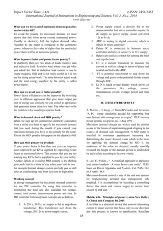 This document discusses energy management using a maximum demand controller. It begins with an introduction that explains the purpose of maximum demand meters is to monitor and control maximum power demand in order to reduce monthly electricity bills. It then provides background information on maximum demand, including definitions and why controlling maximum demand is important. The document also includes sections on the basic concepts and components of a maximum demand controller, including how it works to disconnect non-critical loads and avoid exceeding the contracted power limit. It discusses the potential applications and advantages of using a maximum demand controller.