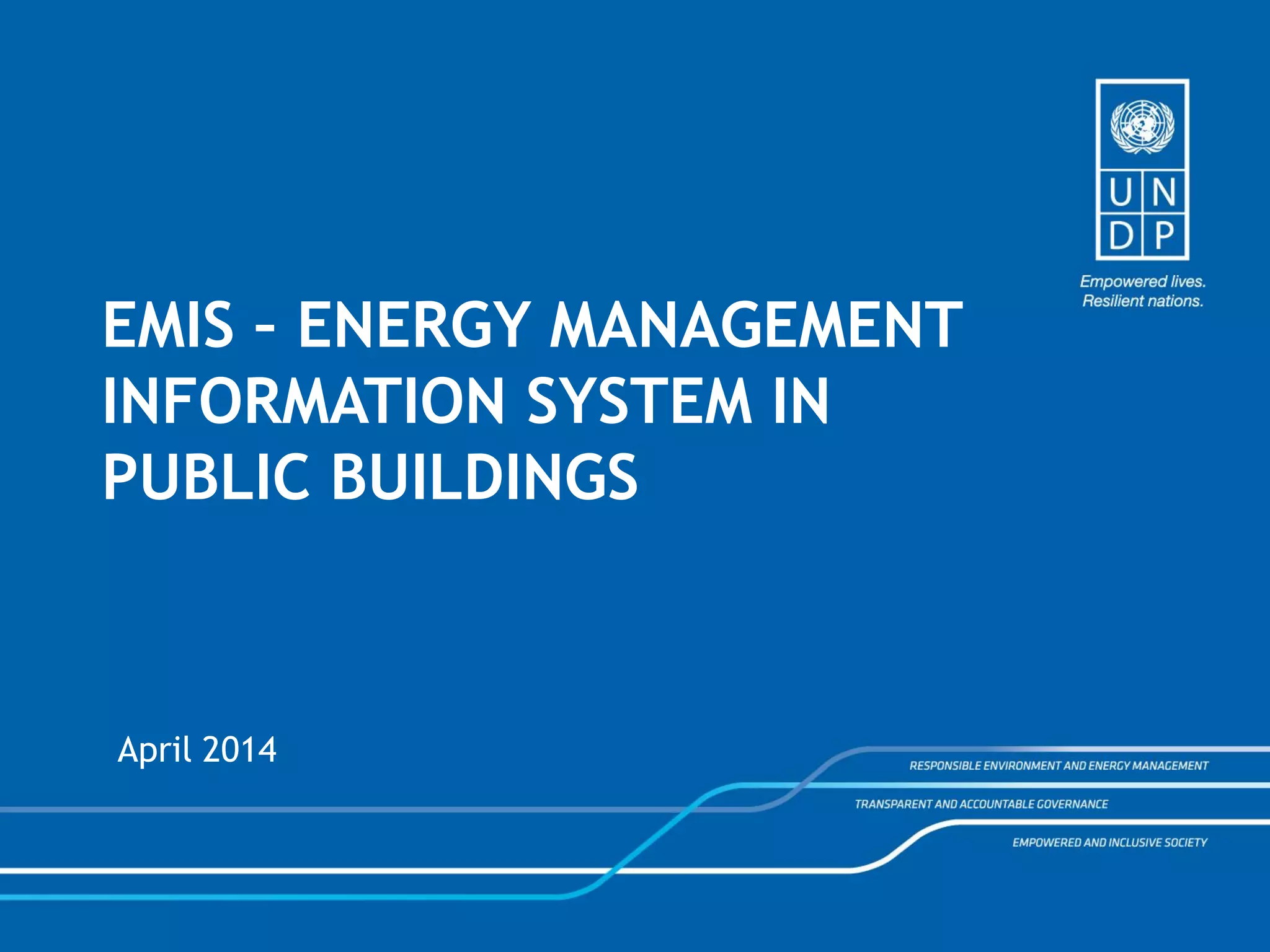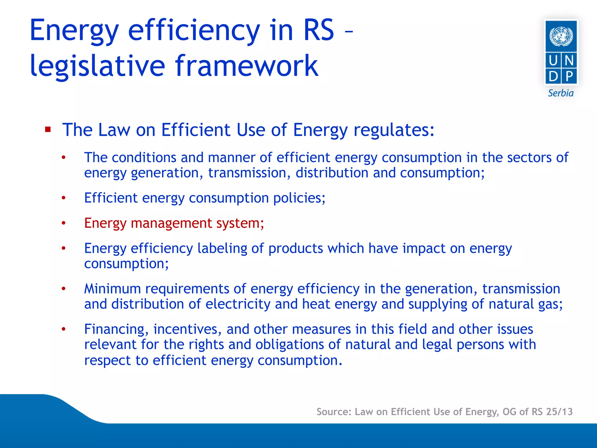 The document discusses energy management in public buildings in Serbia. It outlines the legislative framework for energy efficiency in Serbia and describes the key policy documents. It then explains Serbia's energy management system, including the roles of the government, ministry, designated organizations, energy managers, and energy auditors. The document introduces the Energy Management Information System (EMIS) project, which donated a web-based software application to the Serbian Ministry of Mining and Energy for monitoring energy and water consumption in public buildings. It provides information on EMIS obligations and functions for end users, as well as guidelines for using the system.