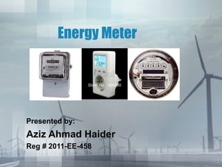 An energy meter measures the amount of electrical energy consumed. It works by using magnetic fields to rotate an aluminum disk, whose rotation is proportional to energy usage. The disk's rotation is retarded by permanent magnets to prevent over-rotation. Its movement is registered by mechanical counters displaying the energy consumed. Traditional meters have drawbacks like friction and flux inaccuracies over time. Smart meters provide more accuracy, longer life, and digital displays to address these issues.